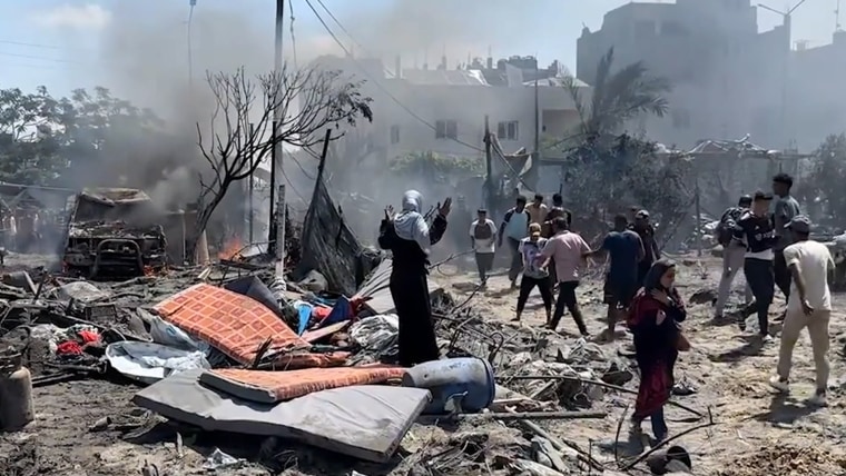 Reuters’ video showed damage and debris as people sifted through the destruction among the white tents used by displaced Palestinians. Another video, posted on Instagram and verified and geolocated by NBC News, showed dozens of people digging with shovels and their bare hands inside a wide blast crater.