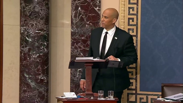 Sen. Cory Booker, D-N.J., took the Senate floor on Monday at 7 p.m. ET and resolved to retain it “for as long as I am physically able.” He did so through the night and into the morning, reading out loud from letters and emails from the everyday Americans hurt by President Donald Trump’s arbitrary and painful spending cuts. Late Tuesday afternoon, Booker was still speaking, leaning on the podium at times, but determined to keep going.